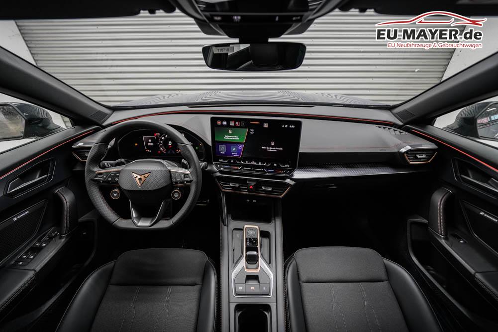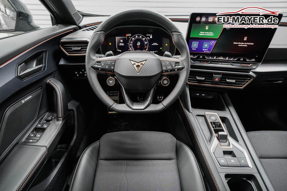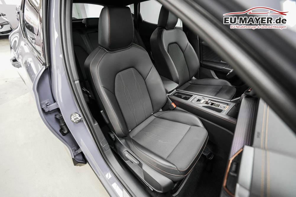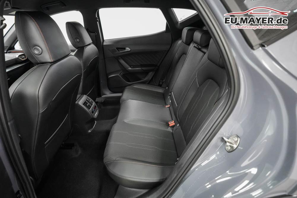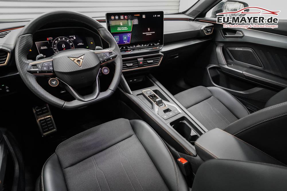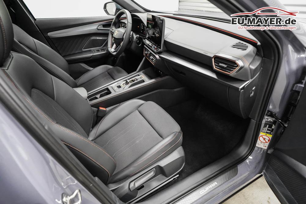 Beifahrersitz höhenverstellbar, Fahrersitz höhenverstellbar, Lederlenkrad, Lendenwirbelstütze, Mittelarmlehne vorne, Sitzbezug Stoff, geteilt umklappbare Rücksitzlehne, Lenkrad höhenverstellbar, Smart Wraparound Interieur Light, Beheizbares Lenkrad, Multifunktionslenkrad, Isofix, Isofix Beifahrersitz, abgedunkelte Scheiben, 18 Zoll Alufelgen , Dachreling schwarz, ABS, Alarmanlage, Außenspiegel elektrisch einstell-/anklappbar, Fensterheber elektrisch, Kopfairbags, Nebelscheinwerfer, Seitenairbags, Servolenkung, Sitzheizung, ESP, Wegfahrsperre, Außenspiegel beheizbar, Beifahrerairbag, Fahrerairbag, Parkpilot hinten, Parkpilot vorne, Reifendruckkontrolle, Regensensor, Lichtsensor, Digital Cockpit, Anhängekupplung schwenkbar, Tempomat Abstand ACC, Spurhalteassistent, Verkehrszeichenerkennung, LED-Scheinwerfer, Tagfahrlicht, Rückfahrkamera, Elektrische Heckklappe inkl. Virtual Pedal, KeylessEntry, StartStopSystem, Innenspiegel automatisch abbl., Müdigkeitswarnsystem, Notrufsystem, Schaltwippen, Klimaautomatik 3-Zonen, Geschwindigkeitsbegrenzer, Android Auto, Apple Carplay, Freisprecheinrichtung, Induktionsladestation, Sprachsteuerung, USB, Radio, Radio DAB, Bluetooth, Bordcomputer, IMMERSIVE by Sennheiser, Cupra Full Link, Full Link, variabler Ladeboden,