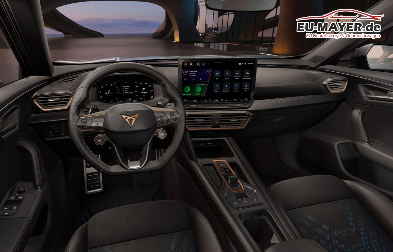 Matrix-LED-Scheinwerfer, Heckklappe/-Deckel elektr. betätigt (öffnen + schliessen, sensorgesteuert), Kamerasystem Umgebungsansicht (Top View, 360°), Winter-Paket (Sitzheizung vorn), Full Link (MirrorLink, Apple CarPlay und Android Auto), Induktionsladeschale für Smartphone, Pedale Dark Aluminium-Design, Fahrassistenz-System: Pre-Crash-System, Außenspiegel elektr. verstell- und heizbar mit Spiegelabsenkung und Welcome Light, Bluetooth Freisprecheinrichtung, Diebstahl-Warnanlage, Einparkhilfe vorn und hinten, Fahrassistenz-System: Totwinkel-Assistent mit Auspark-Assistent, Spurwechselassistent und Aussteigswarnung, Heckleuchten LED mit Ceremony Light und dynamischen Blinkern, Infotainment-System mit 12,9 Zoll Farb-Touchscreen, Intelligent Park Assist (IPA), Kofferraum mit doppeltem Ladeboden, Lenkrad heizbar mit Multifunktion, Schaltfunktion und Cupra Fahrmodusschalter, LM-Felgen 19 Zoll "Sandstorm", Reifen 245/40 R19, Schadstoffarm nach Abgasnorm Euro 6e (EU6 EA), Sitz vorn links elektr. verstellbar (mit Memory), Sitzpolster: Kunstleder/Dinamica Kombination, Stau-/Ablagefach unter Vordersitz rechts, Licht- und Sicht-Paket (Innenspiegel mit Abblendautomatik / Licht- und Regensensor / Lichtassistent (Coming Home, Leaving Home)), Audio-Navigationssystem mit Touchscreen Farbbildschirm (Sprachsteuerungs-System), Schließ-/Startsystem Kessy Advanced (Zentralverriegelung mit Fernbedienung), Fahrassistenz-System: Spurhalteassistent (Frontkamera), Ambiente-Beleuchtung Smart Ambient Light, Dachhimmel schwarz, Einstiegsleisten (Aluminium) vorn, beleuchtet, Fensterzierleisten schwarz hochglänzend, Karosserie: 5-türig, Kombiinstrument digital (virtual cockpit), Lendenwirbelstütze Sitz vorn links, verstellbar, Mittelkonsole vorn mit Mittelarmlehne, Becherhalter, Ablagebox und Luftausströmer hinten, Motor 2,0 Ltr. - 228 kW 16V TSI, Otto-Partikelfilter (OPF), Parkbremse elektrisch, Radioempfang digital (DAB+), Sonnenblende links mit Spiegel (beleuchtet), Sonnenblende rechts mit Spiegel (beleuchtet), USB-Ladeanschlüsse (2-fach, Typ C) für 2.Sitzreihe, USB-Schnittstelle vorn (2-fach, Typ C), Anti-Blockier-System (ABS), Antriebs-Schlupfregelung (ASR), Antriebsart: Allradantrieb, Elektron. Differentialsperre (XDS), Elektron. Stabilitätskontrolle (ESC), Fahrassistenz-System: Adaptive Fahrwerksregelung (DCC), Getriebe 7-Gang - Doppelkupplungsgetriebe DSG, Klimaanlage Climatronic 3-Zonen, Airbag Beifahrerseite abschaltbar, Airbag Fahrer-/Beifahrerseite, Seitenscheiben hinten und Heckscheibe abgedunkelt, Sport-Schalensitze vorn mit integrierten Kopfstützen, Fahrassistenz-System: Fahrprofilauswahl (CUPRA Drive Profile), Dachreling schwarz, hochglänzend, Wärmeschutzverglasung, Fahrassistenz-Paket: Stau- und Notfallassistent, Fahrassistenz-System: Automatische Distanzregelung (ACC), Servolenkung elektro-mechanisch, Blinkleuchten LED in Außenspiegel integriert, Fahrassistenz-System: Fernlichtassistent, Tagfahrlicht LED