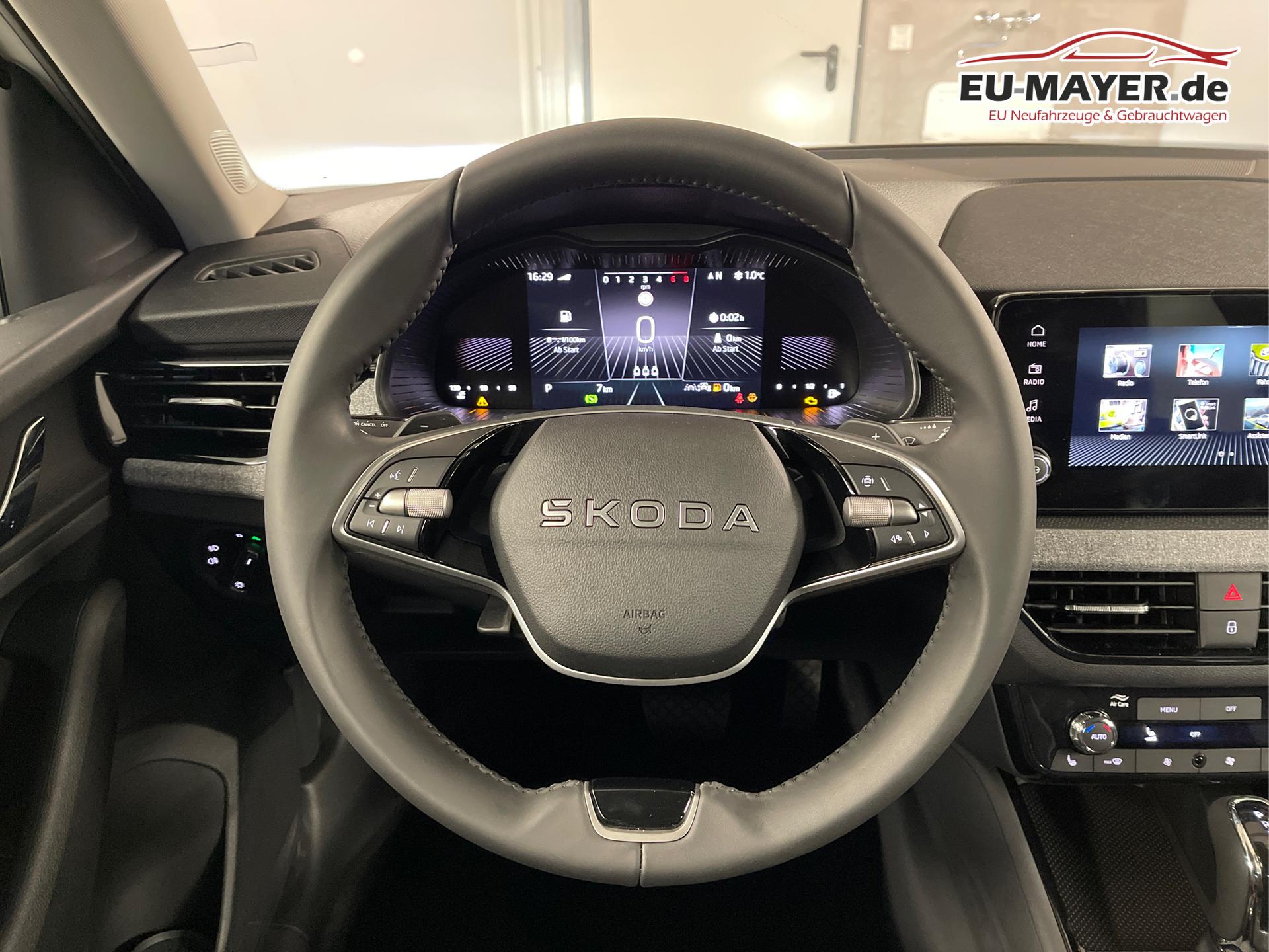 • 16 Zoll Leichtmetallräder, Airbag für Fahrer und Beifahrer, Beifahrerairbag-Deaktivierung, Seitenairbag vorn mit Kopfairbag, Notrufsystem eCall, Dachreling in Schwarz, Klimaautomatik 2-Zonen-Climatronic, USB-C Schnittstelle, Digitaler Radioempfang DAB, Digital Cockpit inkl. Bordcomputer, Scheibenbremsen vorn und hinten, ESC, ABS, ASR, Front Assist inkl. City-Notbremsfunktion, Fensterheber vorn und hinten elektrisch, Berganfahrassistent, Wegfahrsperre elektronisch, Zentralverriegelung mit Funkfernbedienung, Waschwasser-Standanzeige, Mittelarmlehne vorne Jumbo Box, Lichtsensor, Raucherpaket, Isofix Beifahrersitz, Freisprecheinrichtung Bluetooth, 12 Volt Steckdose, Reserverad als Notrad, Vordersitze höhenverstellbar, Radio Skoda Infotainment, Heckscheiben Wisch-Waschanlage, Lendenwirbelstütze für die Vordersitzlehnen, Brillenhalter, Geschwindigkeitsregelanlage mit Speed-Limiter, Reifendruckkontrolle, Verkehrszeichenerkennung, Kopfstützen, Multifunktions-Lederlenkrad mit Schaltwippen, Lenksäule höhenverstellbar, Wireless App-Connect, Servolenkung, Dreipunkt-Sicherheitsgurte, Rücksitzlehne geteilt umklappbar, Sicherheitsinnenspiegel automatisch abblendend, Spurhalteassistent, Start-Stopp-Anlage