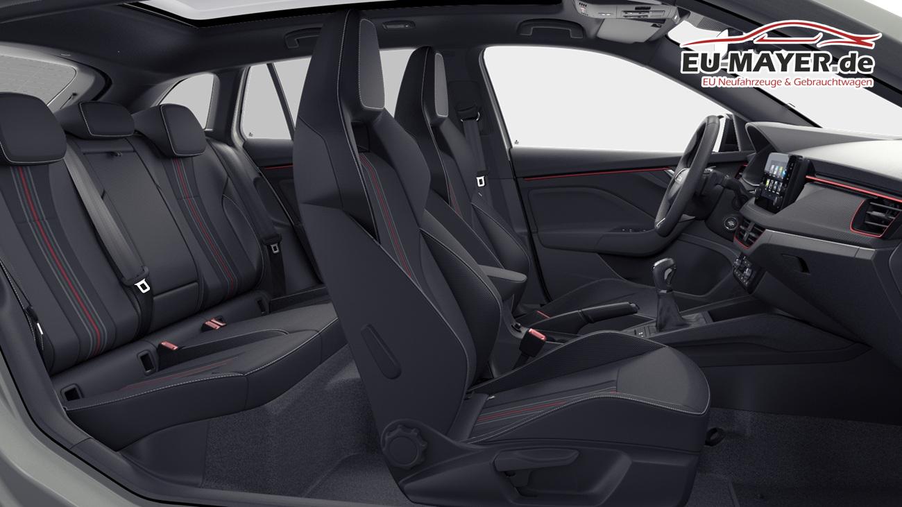 Design Selection MONTE CARLO, Stoff in Schwarz und Rot, Sportsitze vorn mit integrierter Kopfstütze, Dekor Monte Carlo Carbon, Interieurleisten und Luftausströmerumrandung in Schwarz glänzend mit Kontrastline in Rot, LED-Ambientebeleuchtung (2-farbig, weiß oder rot), Mittelarmlehne hinten, Türeinstiegsleisten, Pedalerie in Edelstahl-Optik