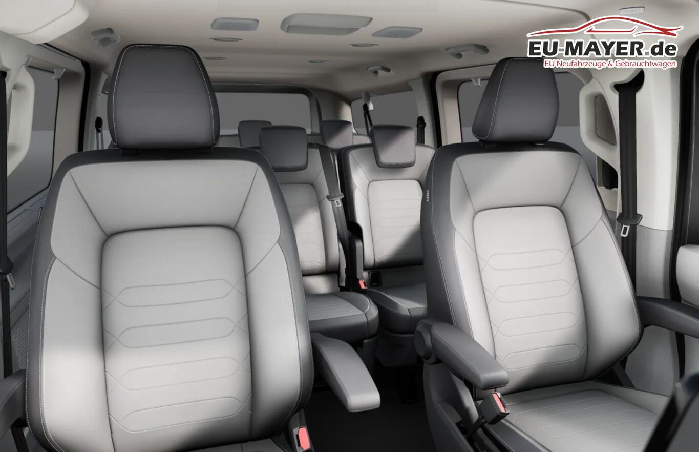 Navigationssystem mit Touchscreen-Farbdisplay 13" mit App-Connect Wireless, Fahrassistenz-Paket Plus (Rückfahrkamera / Fahrassistenz-System: Einparkhilfe vorn und hinten), Vorbereitung Anhängerkupplung (Kabel), Sonnenschutzrollo im Fahrgastraum, Fenster im Lade-/FG-Raum: - ausstellbar, vorn links, Fenster im Lade-/FG-Raum: - ausstellbar, vorn rechts, Kraftstofftank: 70 Ltr., 12V-Steckdose an D-Säule rechts, 12V-Steckdose in der Mittelkonsole, Außenspiegel elektr. verstell-, heiz- und anklappbar, Handschuhfach beleuchtet, Lenkrad (Kunstleder) mit Multifunktion, Reifen 215/60 R17, Schmutzfänger vorn und hinten, Sitze vorn verstellbar (6-fach), Ablagen: Schale/Fach unter Dachhimmel vorn, Außenspiegel und Türgriffe außen in Wagenfarbe, Ausstattungs-Paket: Exterieur-Paket, Anbauteile lackiert, Kühlergrill & Stoßfänger in Wagenfarbe und Chromspange, Batterie 80 Ah, Bodenbelag: Teppich, Digital Cockpit (Instrumentenanzeige Digital), Doppeltonfanfare, Einstiegsleisten Schiebetür (Metall) beleuchtet, Frontscheibe Verbundglas, Haltegriffe am Dachrahmen Fahrer-/Beifahrerseite, Haltegriff an B-Säule Fahrgastraum, Heckscheibe heizbar, Heckscheibenwischer mit Waschanlage, Innenleuchten im Fahrerhaus: LED, Innenleuchten im Lade-/FG-Raum: LED (Gepäckraum), Innenspiegel abblendbar, Karosserie/Aufbau: Bus, Kopfstützen vorn höhen-/neigungsverstellbar, Lautsprecher (10), Motor 2,0 Ltr. - 110 kW TDI, Schiebetüren Lade-/Fahrgastraum links/rechts inkl. Zuziehhilfe, Schließ-/Startsystem Keyless Access ohne Safesicherung, Sitz-Paket 27: Fahrer- und Beifahrersitz, inkl. Sitzheizung und Seitenairbag, Kunstleder, Sitzausstattung: 8-Sitzer, Sitze im Fahrerhaus: Lendenwirbelstützen Fahrer- und Beifahrersitz, Sitze im Lade-/FG-Raum: 1.Reihe, 3 Einzelsitze klapp- und wickelbar und 2.Reihe, 3er-Sitzbank, 6x Isofix, 4x Top Tether, Stoßfänger in Wagenfarbe, Vorbereitung für VW Connect, Mobiltelefon Schnittstelle Bluetooth, USB-Anschluss 7-fach im Fahrerhaus und 6-fach im Fahrgastraum, Antriebsart: Frontantrieb, Elektron. Stabilitäts-Programm (ESP), LM-Felgen 6,5x17 (Le Mans, silber), Wegfahrsperre (elektronisch), Getriebe Automatik - (8-Stufen), Klimaanlage Fahrerhaus und Fahrgastraum (3-Zonen mit autom. Regelung) mit Digitales Bedienteil im Fahrgastraum, Zusatzheizung elektrisch, Airbag Fahrer-/Beifahrerseite, Beifahrerairbag abschaltbar, Seitenairbag / Kopfairbag (Curtain-Airbag) vorn und Kopfairbag (Curtain-Airbag) hinten, Sitzbezug / Polsterung: Kunstleder, Sitze im Fahrerhaus: Fahrer- und Beifahrersitz heizbar, Sitze im Fahrerhaus: Fahrer- und Beifahrersitz mit Armlehnen vorn, Verglasung hinten abgedunkelt, Verzurrösen (2), Fahrassistenz-System: Geschwindigkeits-Regelanlage mit Intelligenter Geschwindigkeits-Assistent, Fahrassistenz-System: Verkehrszeichenerkennung mit Falschfahrer-Warnfunktion, Notrufsystem, Fahrassistenz-System: Dynamische Fernlichtregulierung (Dynamic Light Assist), Heckleuchten LED mit exklusiver Lichtsignatur, Matrix-LED-Scheinwerfer (IQ.Light) inkl. Coming- und Leaving-Home, Fahrassistenz-System: Notbrems-Assistent, Fußgänger- und Fahrraderkennung, Ausweichunterstützung und Abbiege-Assistent, Fahrassistenz-System: Spurhalteassistent (Lane Assist)
