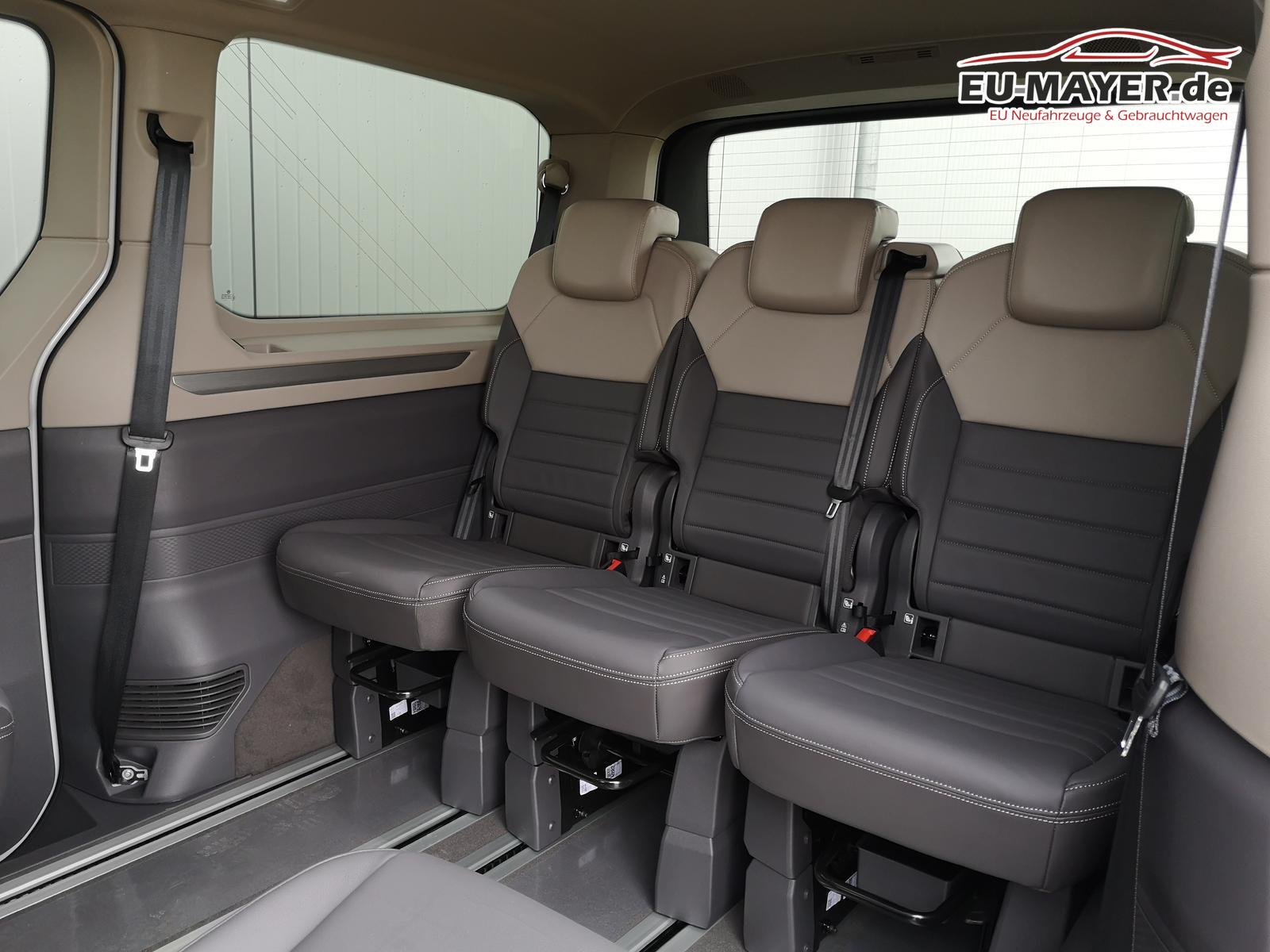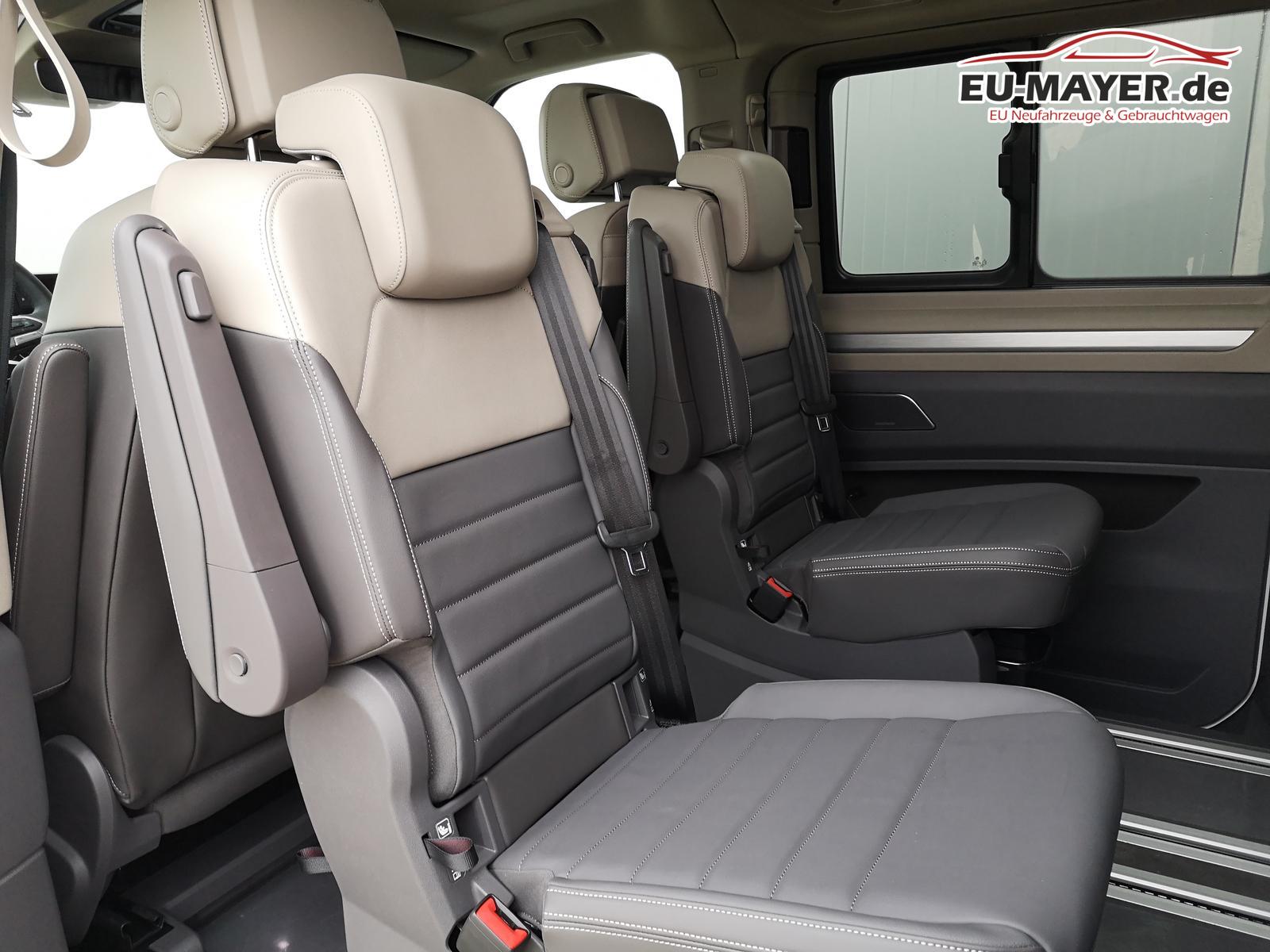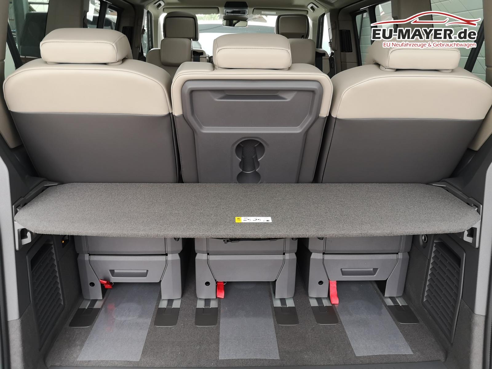 Fahrzeug 8-fach-bereift, Leichtmetallräder 7,5J x 18 (Sport Edition Design TN28, schwarz glanzgedreht) mit Sommerreifen 235 50 R18, Leichtmetallräder 7,5 J x 18 ""Toshima"" schwarz mit Winterreifen (M+S Kennung inkl. Schneeflocke / Allwetterreifen), (0NP) Bulliplakette am Kotflügel, (1U3) Bodenschienen mit Multifunktionstisch inkl. 3 Becherhalter, verschiebbar auf der vollständigen Länge des Schienensystems, (2FT) Multifunktionslederlenkrad beheizbar mit Schaltwippen, (4A3) Sitzheizung vorne, (4GX) Frontscheibe beheizbar und geräuschdämmend, (4K5) Zentralverriegelung Keyless Advance (schlüsselloses Öffnen und Starten),(6I6) Travelassistent, (6KF) Scheinwerferleiste hinterleuchtet, (7AL) Diebstahlwarnanlage, (7UY) Radio Navigationssystem Discover Pro, (9AH) Klimaanlage ""Air Care Climatronic"", (N0K) Sitzbezug Bi-Colour Leder ""Savona"", (1M6) Anhängerkupplung schwenkbar, Parklenkassistent inkl. Rückfahrkamera, (Z8A) Schiebefenster im Fahrgastraum links und rechts, Fenster ab B-Säule abgedunkelt, (ZBR) 7 Sitzer: Sitzvariante 2-2-3 (Vis-a-Vis entgegen der Fahrrichtung) inkl. 4 Armlehnen, (2H5) Fahrprofilauswahl, (3FG) Panoramaglasdach, (7W7) Proaktives Insassenschutzsystem, (9IJ) Mobiltelefon-Schnittstelle ""Comfort"" inkl. induktive Ladestation, (9VV) Soundsystem ""Harman Kardon"" inkl. 13 Lautsprecher, 840 Watt Gesamtleistung und Subwoofer, (KS1) Head Up Display, (P2G) Parkpaket Advance, Parklenkassistent inkl. ""Area View"" inkl. Rückfahrkamera, (ZED) Easy Open Paket Advanced, Umfeldbeleuchtung an der Heckklappe, Ambientebeleuchtung 30-farbig, Heckklappe sowie Schiebetüren elektrisch inkl. Easy Open/Close Funktion,